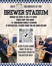 Please join us at the Milwaukee Brewers home games working concession stands. We need a minimum of 5 people each game. Bring your friends. All you need to do is simple training, we can help you if you get stuck and be 16 years of age or older. We will also provide transportation if needed the day of as we typically find carpooling works best. We have to arrive earlier than gates open as we have to set up, but as soon as 7th inning is done, we can clean and go home. Come have some fun, be ready to be busy, and enjoy the energetic atmosphere at the stadium. We would appreciate your help!